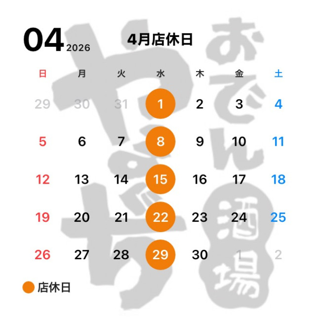 当店の4月の店休日は下記の通りです。